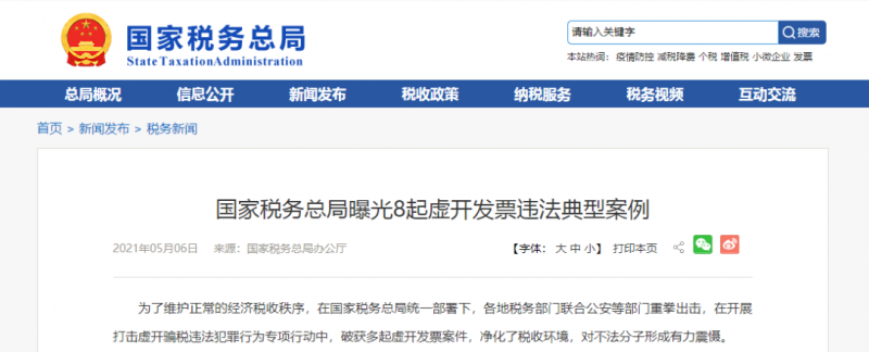 20215月,税务总局曝光8起虚开发票违法典型案例,涉及四川、深圳、北京、湖南、重庆、浙江、上海、江苏等地,中国政府网、央视新闻等集中进行了报道。